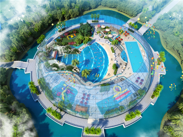 中国龙虾城热带雨林主题水上乐园项目建筑面积逾10000平方米,由直径100米的圆形钢构为主体,空高24米,绿化面积2000余平方米,全年保持22-26度恒温恒湿。由海浪池、漂流河、雪橇滑道、炮筒滑道、螺旋滑道、儿童水寨、迷你飞天梭、9D影院、VR体验馆、游泳池、世界名泉等11个板块组成,可同时容纳1500人戏水游乐。项目由江苏农康旅建设有限公司设计并承建,预计明年6月正式对外开放。