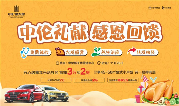 为了让一直以来支持中伦新天地的广大新老客户和朋友更多地了解养生健康的方法和知识,11月28日,中伦新天地将联合知名机构,为大家奉献精彩讲座以及免费体检,为大家健康保驾护航。