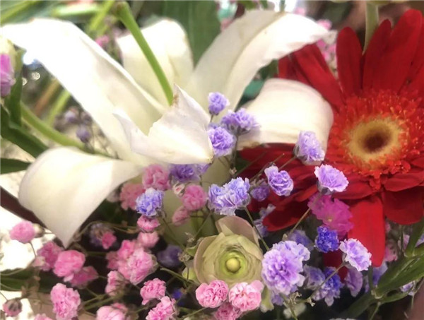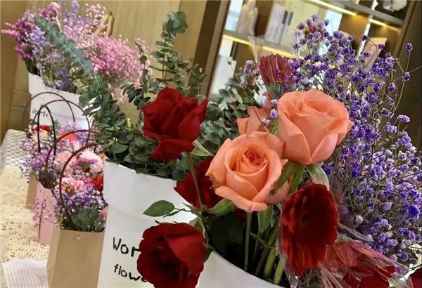 看到桌上摆放的各种花束