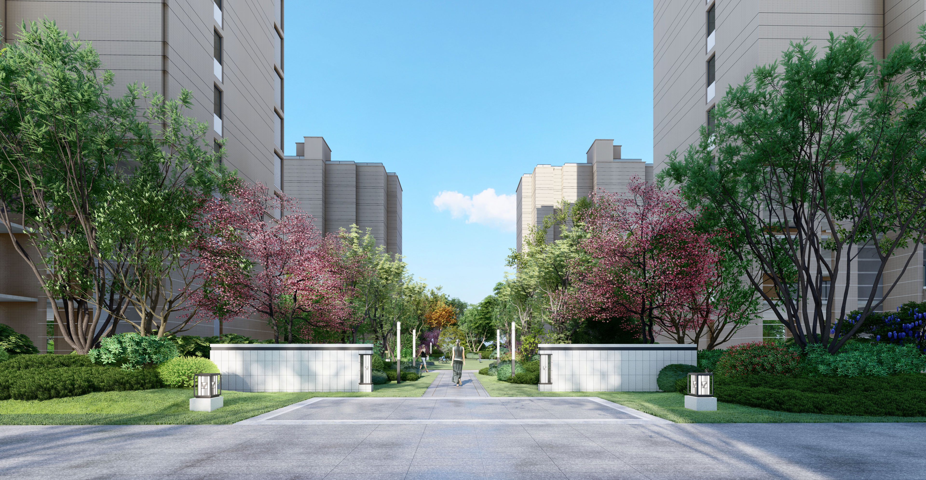 在园区内部的景观营造中,为了与生活气息充分匹配,会显得欢快一些。园区主入口营造出欢乐而充满礼遇的归家氛围,结合葱茏的绿植乔木,既现代,又充满自然韵律,带给人们扑面而来的品质感和闲适氛围。