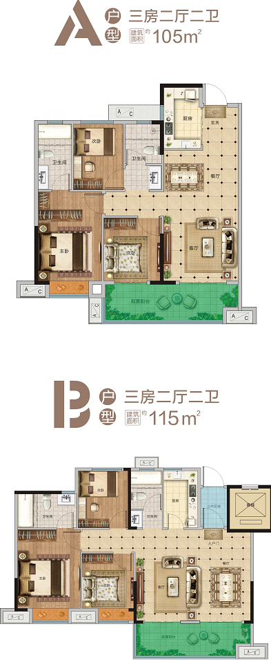 三开间朝南户型代表着更多的采光、更好的通风、更宽阔的视野,可以达到更佳的居住体验。客厅、主卧、次卧三开间一字朝南铺排,餐、客厅连接南北双向阳台,阳光与清风登堂入室,轻松享受充足而温暖的阳光SPA。