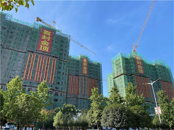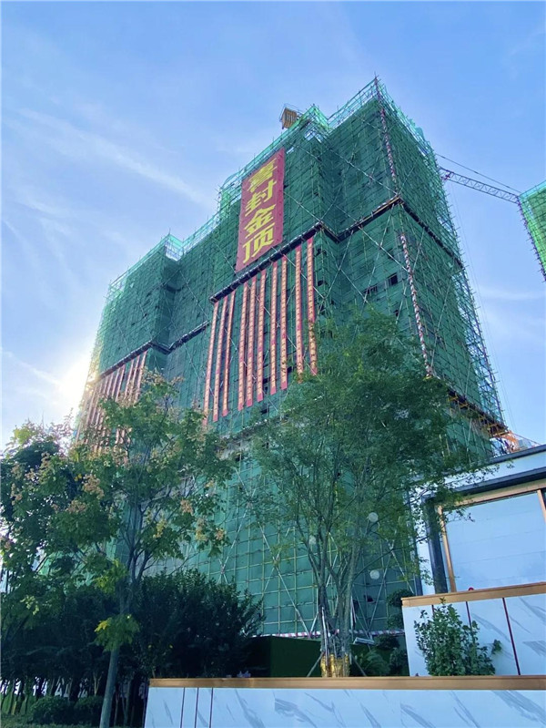 东升·紫悦府首期工程已基本封顶,建筑立面水泥基层展现眼前,主结构巍然矗立,浑然一体,混凝土浇筑缜密细致,耸立的大楼主体上挂满了“喜封金顶”。