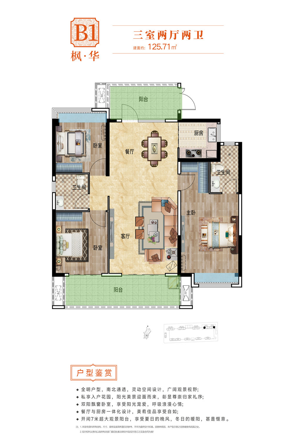 小区采用阶梯式排布,照顾每一户居者的光照及观景体验,南低北高,阳光无遮挡。南向为11层花园洋房,其三开间朝南,南北双阳台,约7㎡入户花园,推门即景;南向约13m宽幕双景阳台,阳光入室内;南北通透、功能分区明确,充分考量采光、私密、视野等细节。