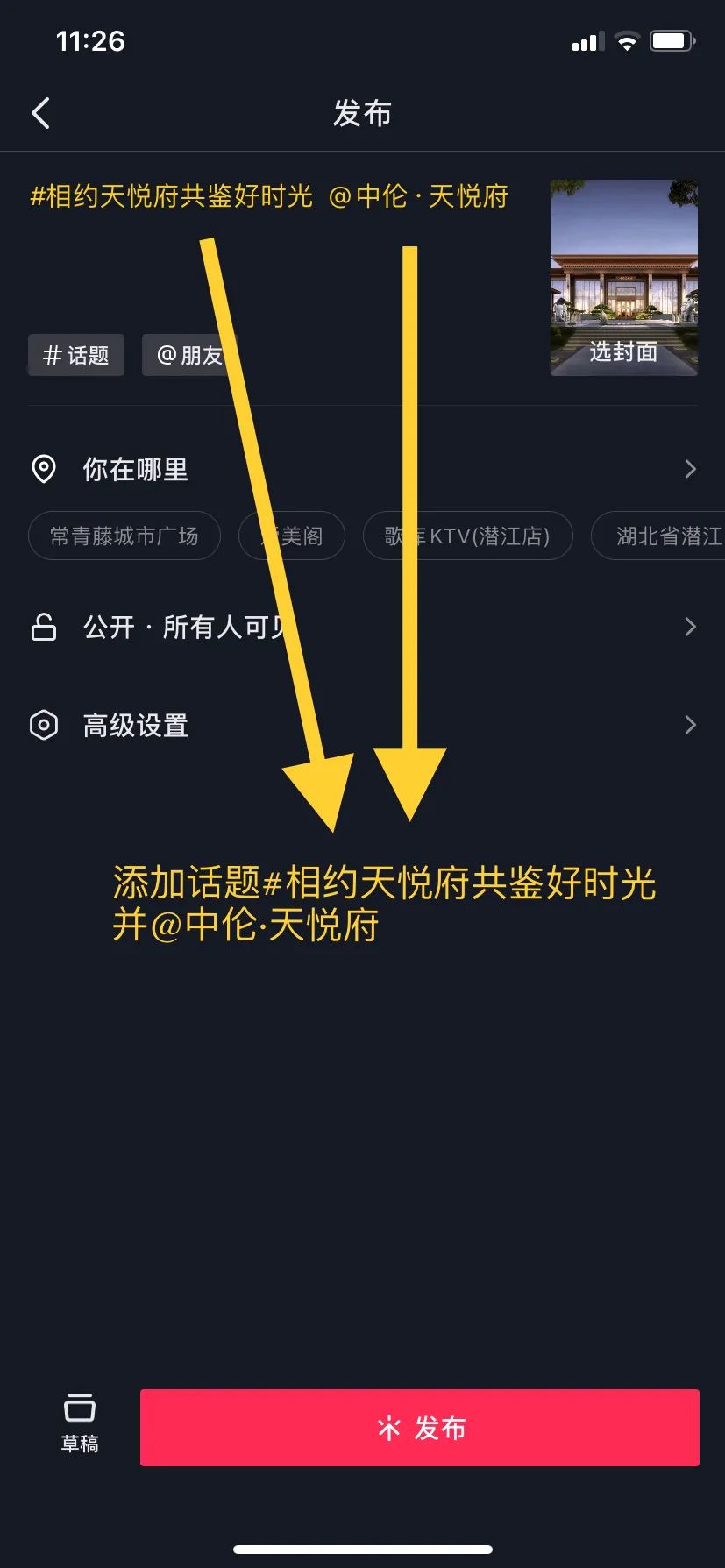 打开抖音APP,从个人账号上传拍摄的作品,添加话题#相约天悦府共鉴好时光,并@中伦·天悦府。