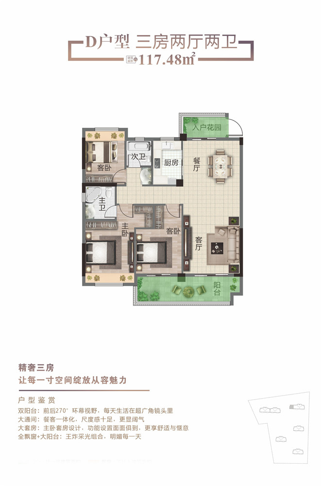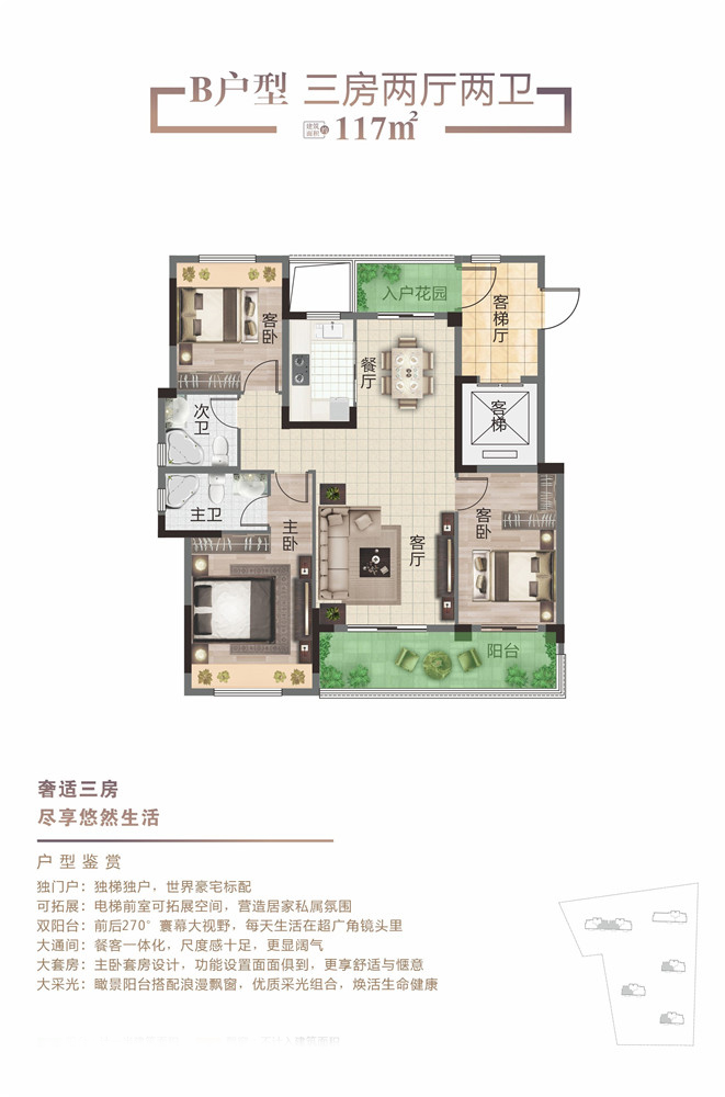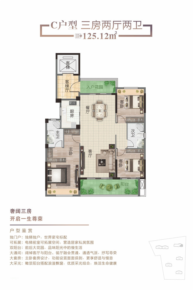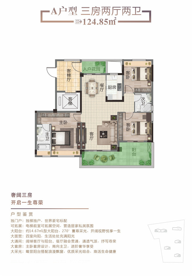 6#楼,总高18层,2梯3户,户型为约115㎡三室两厅两卫、约123㎡三室两厅两卫、约124㎡三室两厅两卫。