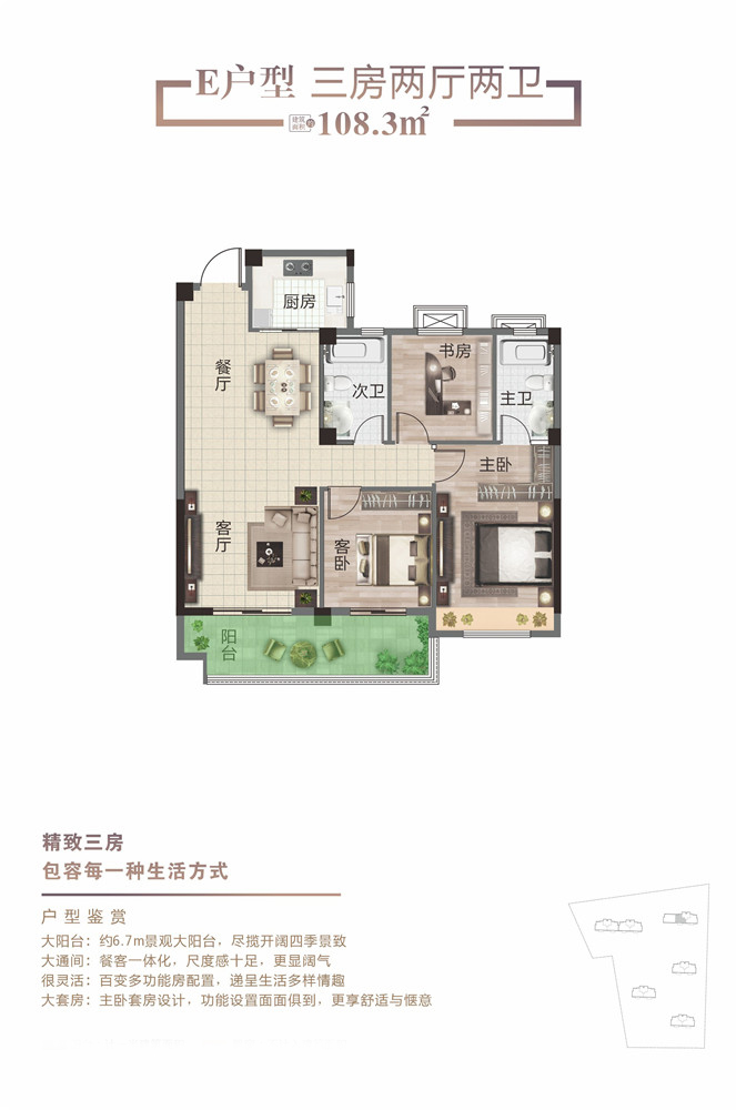 1#楼,总高18层,2梯3户,户型为约108㎡三室两厅两卫、约115㎡三室两厅两卫、约123㎡三室两厅两卫。