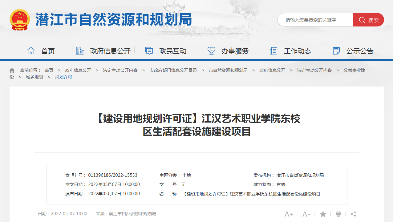 江汉艺术职业学院东校区生活配套设施建设已取得规划许可证