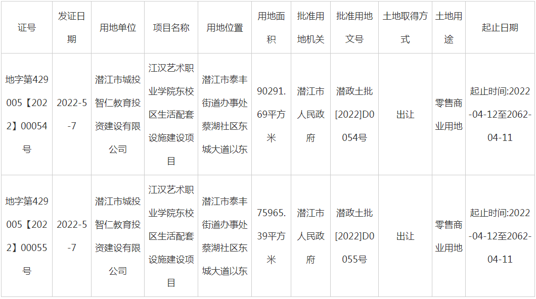 用地单位都为:潜江市城投智仁教育投资建设有限公司