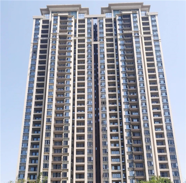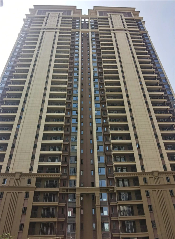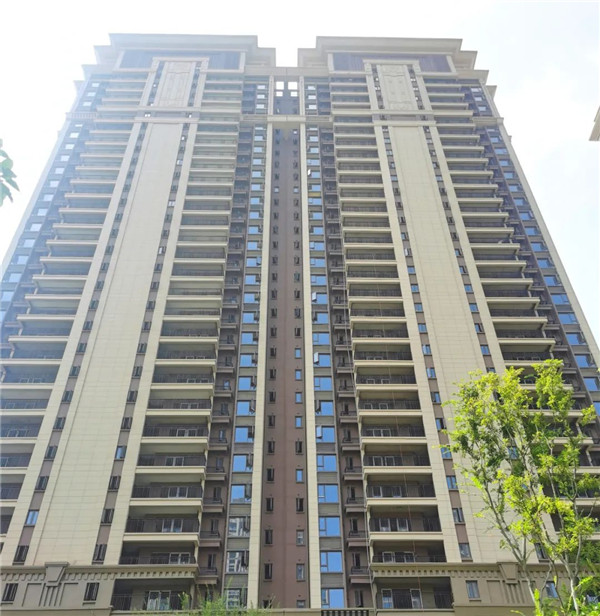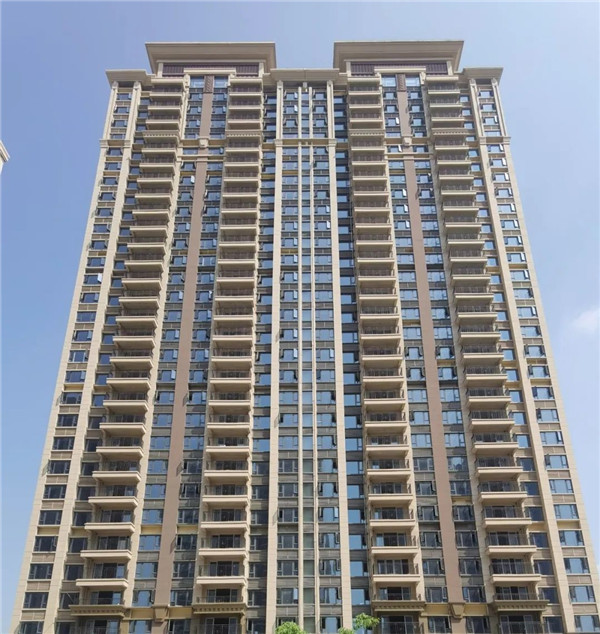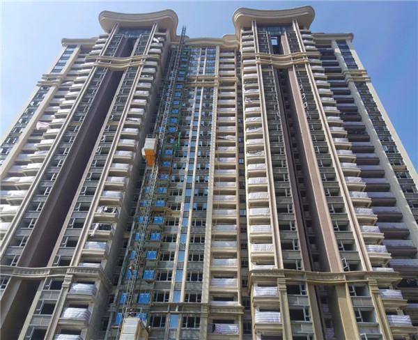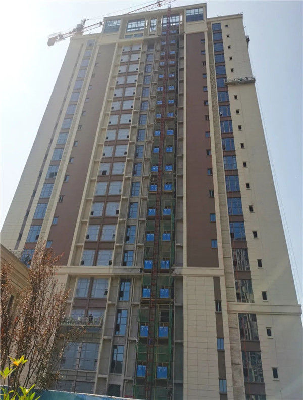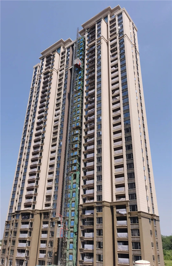 楼主体封顶,砌体完成,外立面外粉完成,抗裂完成,腻子完成,外架拆除完成,外墙真石漆整体完成(除施工升降机位置),内粉完成,外墙内保温完成,楼梯踏步砖完成。