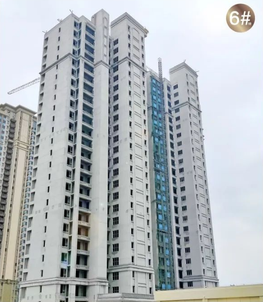 6#楼主体结构封顶完成,砌体施工完成,外墙抹灰完成,外架拆除完成,外墙涂料完成15%(外架、塔吊已安装)