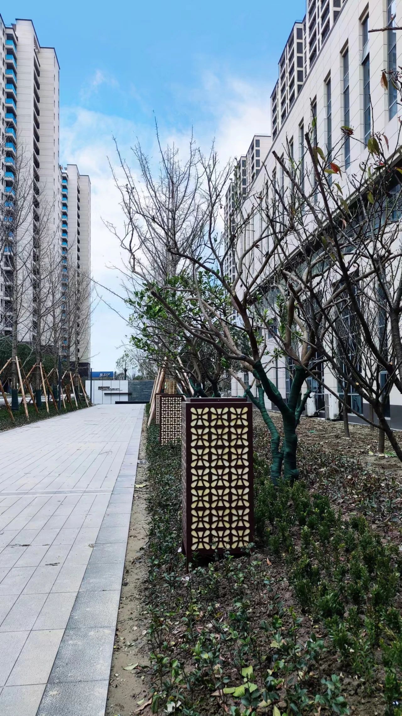 室外:园区乔木、灌木等所有绿植已全部种植完成;室外水、电、气管网完成90%,园区内路面石材铺装工作完成80%,正在进行廊架、景厅施工,实景现房完美呈现。