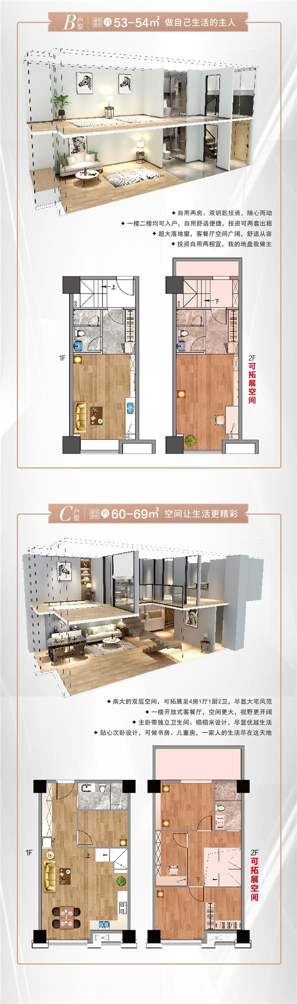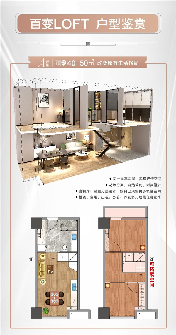 建面约40-50㎡百变LOFT,除了颜值、风格前卫外,室内空间灵活度也很高;4.9/5.3米挑高,一层价格双层享受,居家休闲、互联网办公、创意工作室、特色民宿,利用这一小天地创造出大大的价值。总价低,三年O利息,更低门槛更小压力;宜住宜商宜办公,以小见大,样样兼得。让你更快地获得收益,减少资金空白期。