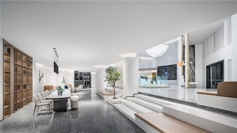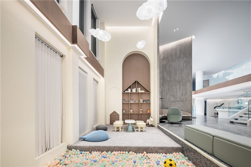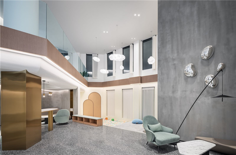 整个售楼部分为两层,楼下是沙盘和大会客厅,前来看房、买房的、了解项目的客户,大家都可以在这里得到自己想要的信息,同时还有热情满满的工作人员进行详细的讲解和暖心的服务。不仅如此,还配设专门供小孩玩耍的娱乐空间。