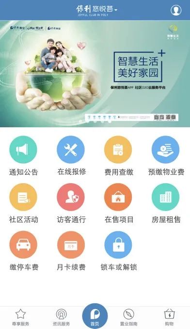 业主专属手机客户端——保利悠悦荟APP,实时推送公告信息,手机刷屏完成物业费缴纳;一键报修、访客通行、在线咨询,尽享便捷服务;服务全覆盖,不必来回奔波。
