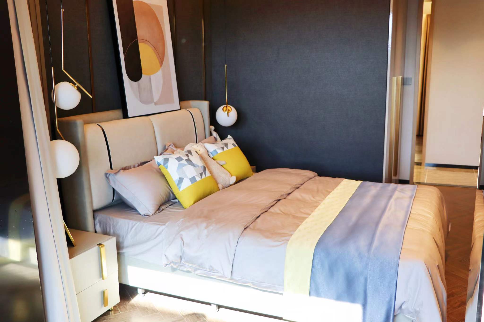 双南卧设计,让生活起居亲近阳光。南向主卧连通观景阳台,配有飘窗设计,保证采光,亲和自然,窗外绿意尽收眼底。