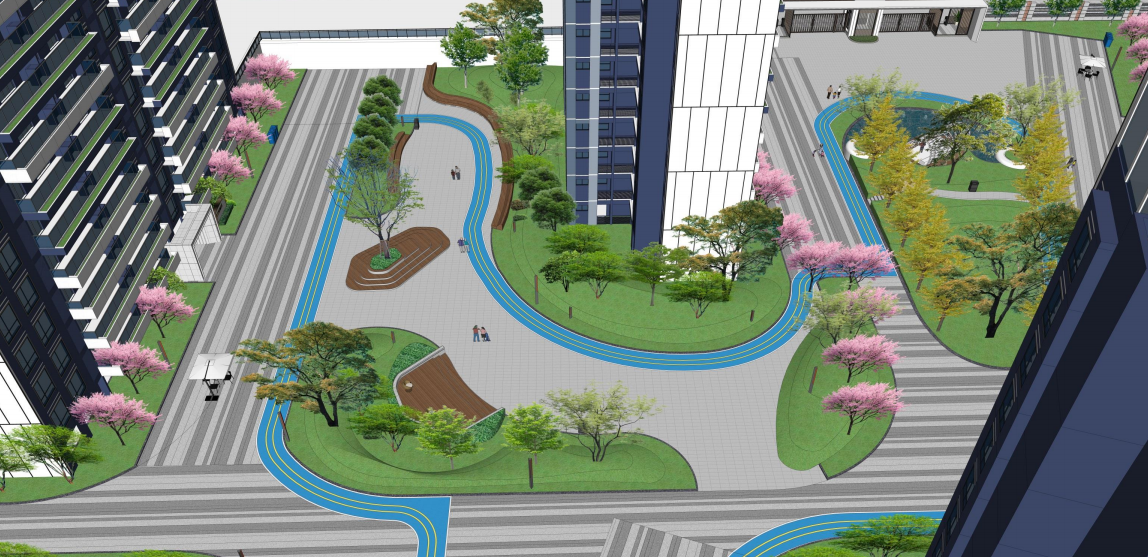 凯盛奇·东城壹号自身规划“一环、三庭、六轴、八景”全龄段主题乐园,配备约900米乐环跑道,一座全龄生态运动型生态公园园林。