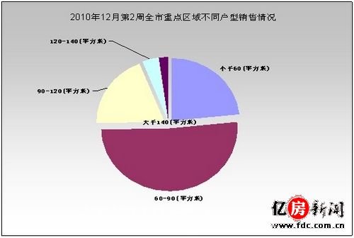 从各区域不同户型住宅销售套数来看,60-90平方米的户型成交量大,共成交了357套,占到全市销售套数的51.32%,其次是60平方米 以下的户型,共成交了163套,占全市总销量的23.43%;90-120平方米的户型成交了132套,占全市总销量的19.08%; 120-140平方米的成交了28套,占全市总销量的4.02%,140平方米以上成交了15套,占比为2.15%。