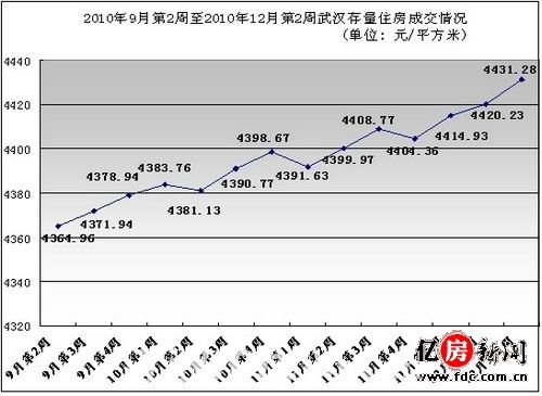 12月2周(12月9日-12月15日),据亿房研究的统计数据显示,武汉二手住宅平均价格为4431.28元/平方米,与上周相比,上升了11.05元/平方米,环比涨幅为0.25%。