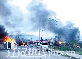 11月2日下午1时50分许,在云南昭通市昭阳区凤凰街道办事处凤凰桥桥头发生一起让人心惊肉跳的冲突事件,场面异常混乱和惊险,当场造成8辆汽车被先砸损后又遭汽油焚毁,其他少30辆汽车被石头、锄头、棍棒等物不同程度地砸损。