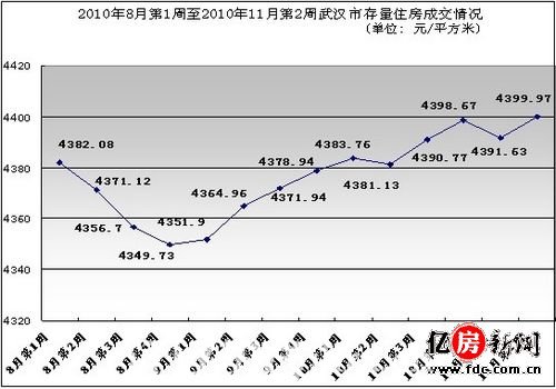 11月2周(11月4日-11月10日),据亿房研究的统计数据显示,武汉二手住宅平均价格为4399.97元/平方米,与上周相比,上升了8.34元/平方米,环比涨幅为0.19%。