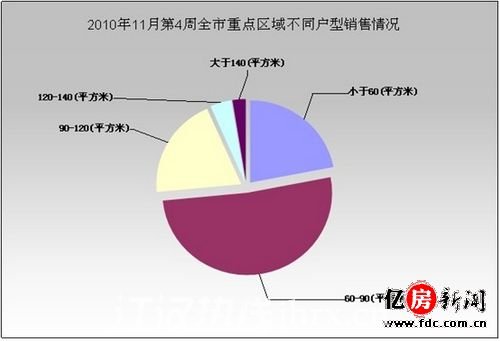 从各区域不同户型住宅销售套数来看,60-90平方米的户型成交量大,共成交了305套,占到全市销售套数的51.44%,其次是60平方米 以下的户型,共成交了130套,占全市总销量的21.91%; 90-120平方米的户型成交了118套,占全市总销量的20.05%; 120-140平方米的成交了24套,占全市总销量的3.99%,140平方米以上成交了15套,占比为2.61%。