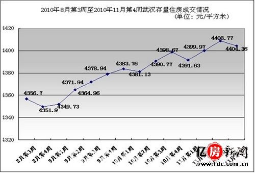 11月4周(11月18日-11月24日),据亿房研究的统计数据显示,武汉二手住宅平均价格为4404.36元/平方米,与上周相比,下降了4.41元/平方米,环比涨幅为0.1%。