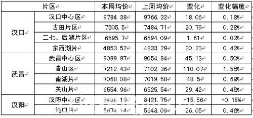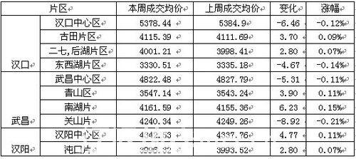 本周武汉主城区楼市,成交均价方面,除汉阳区成交均价有所下跌外,其他片区成交均价较上周继续有所上涨,其中,青山区在新项目开盘且成交价 高于区域成交均价影响下,价格涨幅大,环比上周上涨1.55%,其他价格上涨区域涨幅相对不大,其价格上涨主要是由于在售项目多数价格仍有微涨导致;成 交量方面,汉口区和沌口片成交量较上周均较大幅度增加,但主城区整体周成交量与上周变化不大,周成交量仍然保持在1500套左右,在传统淡季时节,目 前武汉主城区楼市表现仍然“”。