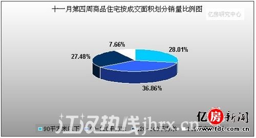 本周商品住宅成交的户型面积主要集中在90-120平方米户型,占到了整体成交量36.86,较上周减少2.06%;90平方米以下户型占到 28.01%,较上周增加4.90%;120-140平方米中大户型成交量占到总量的27.48%,较上周增加0.55%;140平方米以上的成交量占总 量的7.66%,较上周减少3.39%。