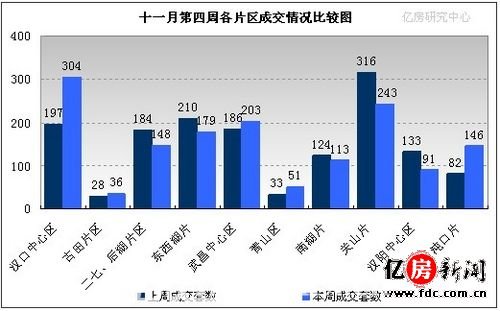 2010年11月4周武汉市二手住宅共成交了592套,与11月3周相比减少了18套,跌幅为2.95%,平均每天成交量为85套。从成交区域来看,汉口区、武昌区和汉阳区的二手住宅成交量有所下降,占整成交量的51.52%。