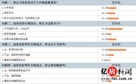 在上期的亿房调查中,近42%的网友中国的房价将没有拐点;如果房价抽筋出现拐点,近58%的网友认为会在20%内拐动;如果房价不光抽筋,还发疯般明年出现拐点,近74%的网友会赶快买房,折紧时间抄底;更有近47%的网友会继续捂盘。